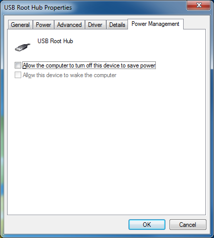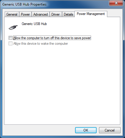 Disable the PC's USB ports' power saving option. The Windows power management settings could be allowing the USB hub device to be turned off to save power. To disable this setting open Control Panel > Administrative Settings > Device Manager > right-click on the USB Root Hub node under Universal Serial Bus Controllers > select Properties > select the Power Management tab > untick Allow the computer to turn off this device to save power > Click OK (refer to screenshots below for more info). Repeat this process for each of the USB Root Hub nodes if there are more than one.