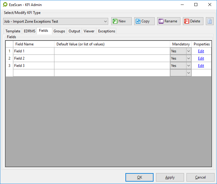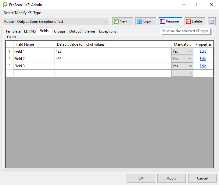Create the same 3 fields you used in the Route KFI. But this time don’t set the default values. The values will be imported from the CSV .txt file (that belongs with each TIF or PDF file) that were generated by the Route ZONE Exceptions rule.
