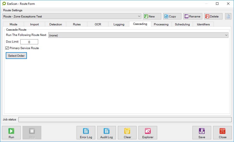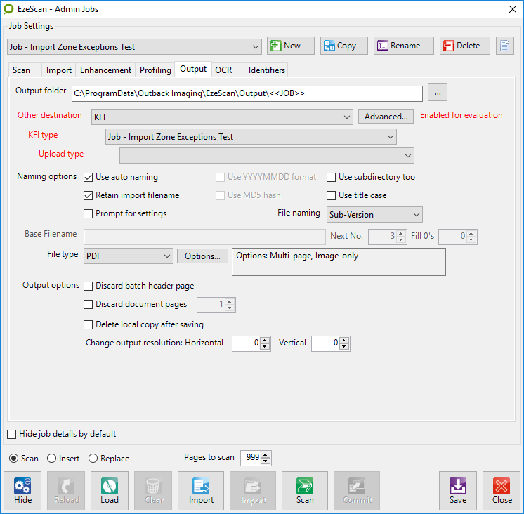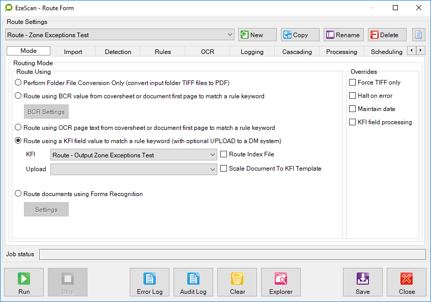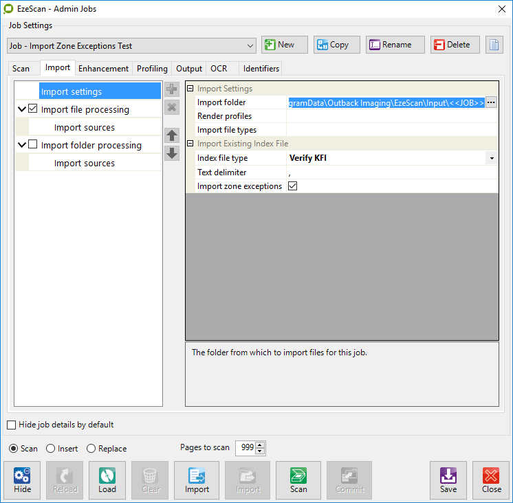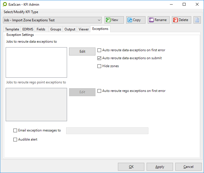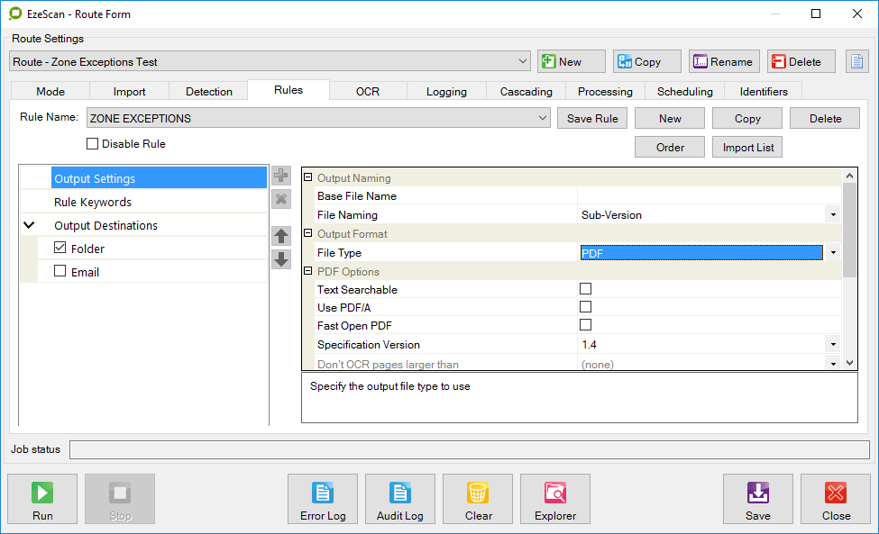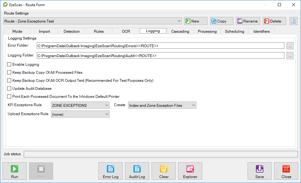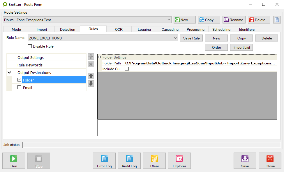 On the Rules tab, add a special rule called ZONE EXCEPTIONS. Set the output folder path of this rule to be the same as the import folder used by your JOB+KFI (e.g. C:\ProgramData\Outback Imaging\EzeScan\Input\Job - Import Zone Exceptions Test).