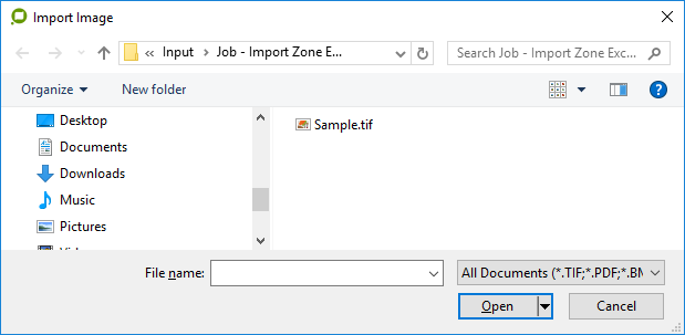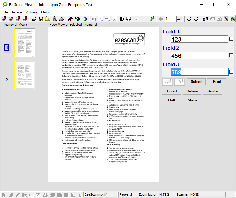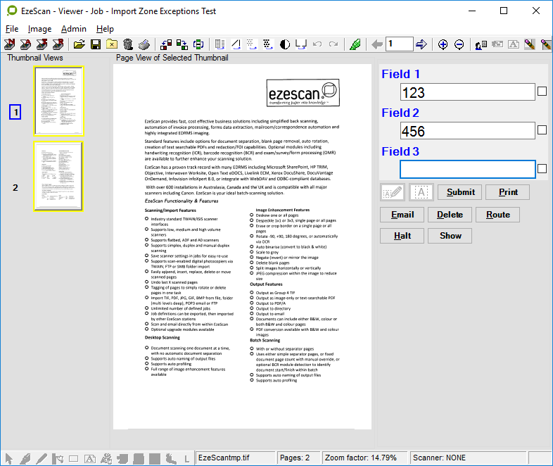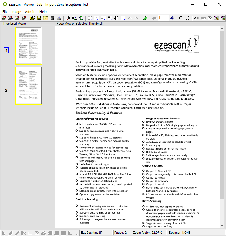 Select the Sample.tif exception image. (Note the import directory does include the Sample.txt file and Sample.ze file, it’s just that the filter is restricted to showing only image type documents). The exception image is loaded into the EzeScan Desktop viewer.