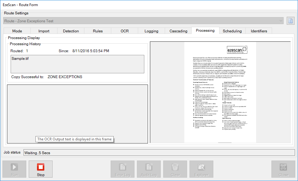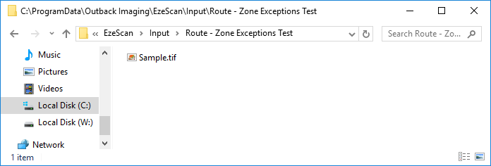 The route is now configured. You are now ready to test that the route does generate an exception file. Copy the c:\Program Files (x86)\Outback Imaging\EzeScan\Samples\Sample.tif
