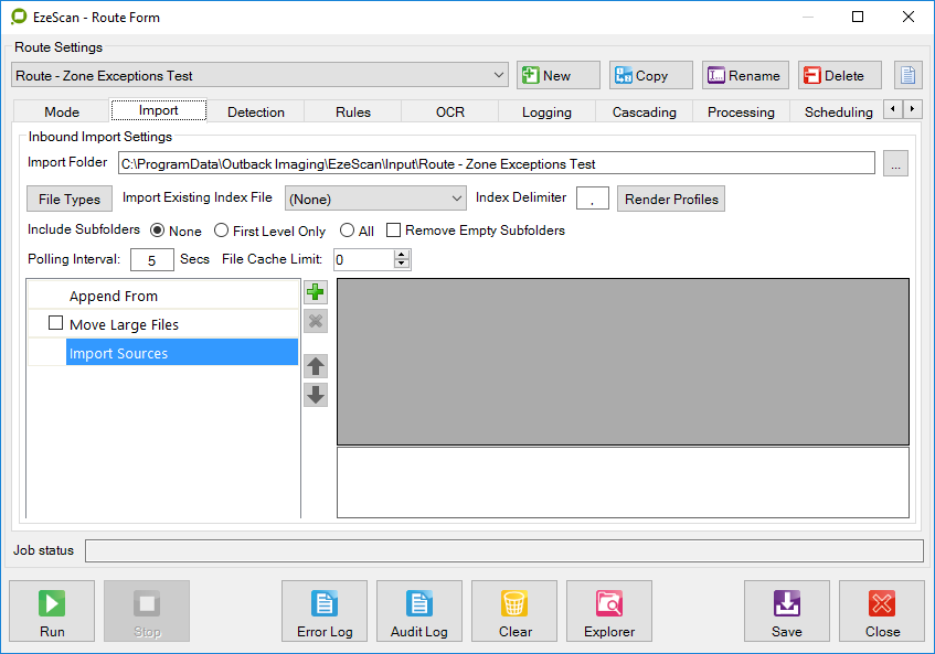 On the Import tab, setup the import directory where the sample images will be placed for processing by the route (e.g. C:\ProgramData\Outback Imaging\EzeScan\Input\Route - Zone Exceptions Test)