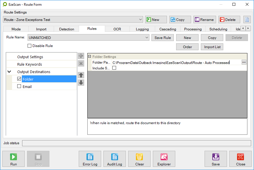 On the Rules tab, used the UNMATCHED RULE output settings to setup the directory where the successfully processed route output files are sent (i.e. those with no field exceptions) (e.g. C:\ProgramData\Outback Imaging\EzeScan\Output\Route - Auto Processed). We are sending an output PDF file and a CSV metadata file to this output folder.