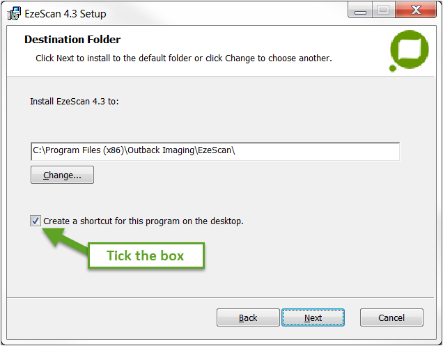 Select Next to accept the default installation directory of C:\Program Files (x86)\Outback Imaging\EzeScan. (If required: Tick to create a shortcut on the desktop)