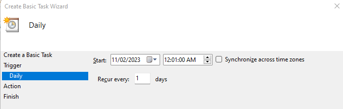 The examples below shows how to do this for an instance of EzeScan Server that is running as a service. It shows how to use 2 scheduled tasks., one to stop the service at 12.01 am and another to restart it at 12.03 am.