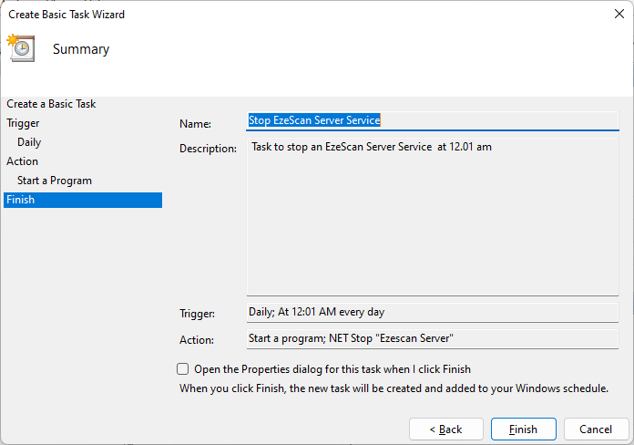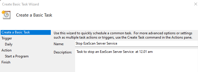 15. Congratulations you have just created a scheduled task that will run at 12.01 am every day that will stop a running EzeScan Server service.