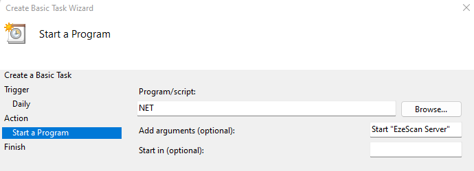 For the Program/Script type NET and add the arguments Start "EzeScan Server" or service name noted earlier (step #3) if different: