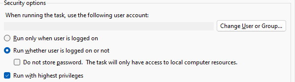 In the General tab select Run whether user is logged in or not and Run with highest privileges: