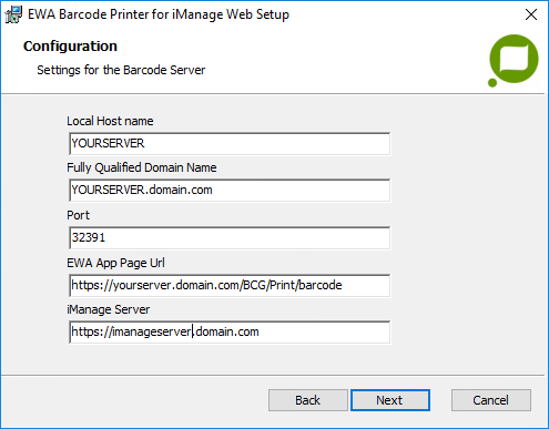 These settings are stored in the configuration file of the Barcode server ("C:\ProgramData\Outback Imaging\EWA Barcode Printer for iManage Web\appsettings.json"). These settings are also used to automatically create Firewall rules and Http reservations.