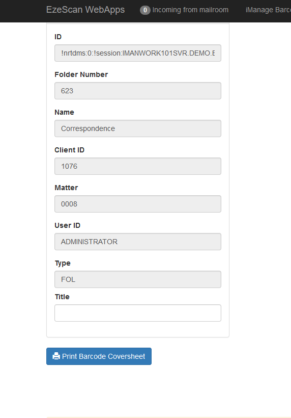 The reason we added this field, is that when we press the ‘’ from the Imanage Work Web client, the iManage Work Web client will pass all of the folder metadata across to our BCG app page. however that data won’t include a value for what we want to name the document that we are going to scan (i.e. the hardcopy document we are placing the iManage barcode coversheet on top of).
