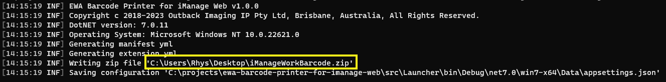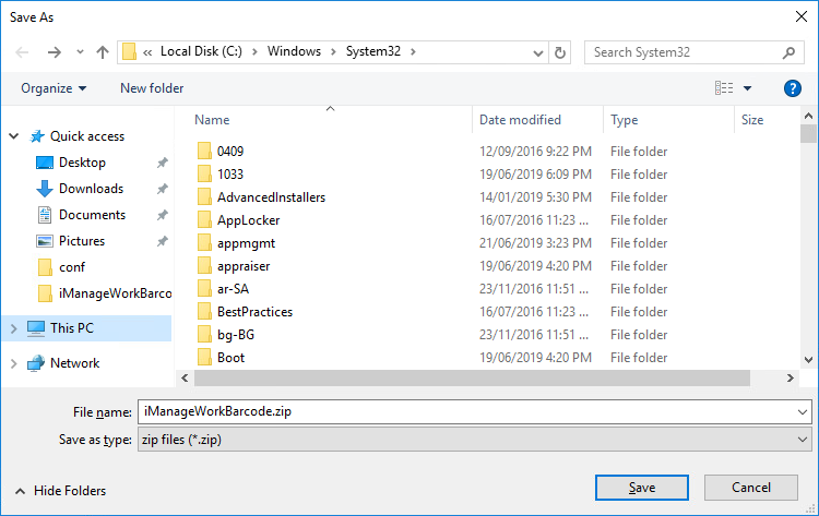 The file iManageWorkBarcode.zip will be saved to the current user’s desktop folder.
