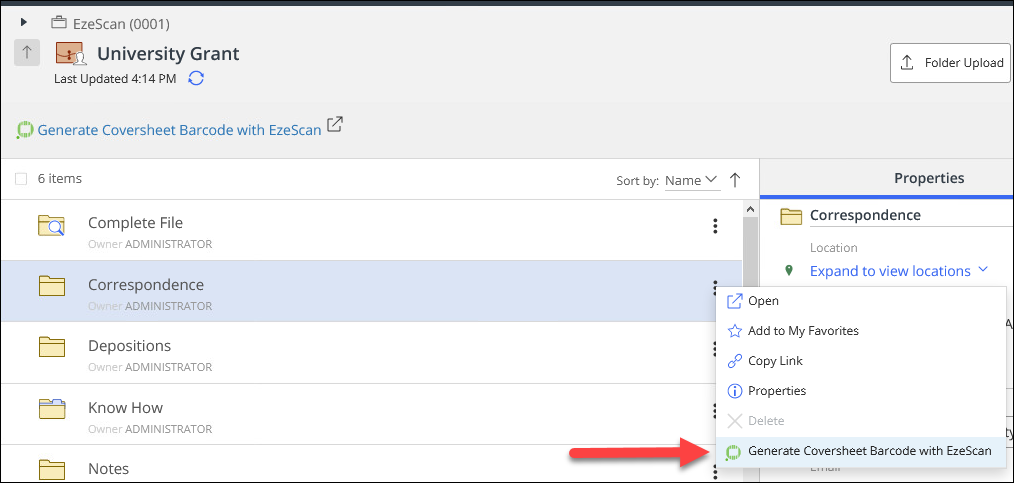 To test the generator, open iManage Work in a web browser, right click on a document or folder (depending on what has been configured and select “Generate Coversheet Barcode with EzeScan”