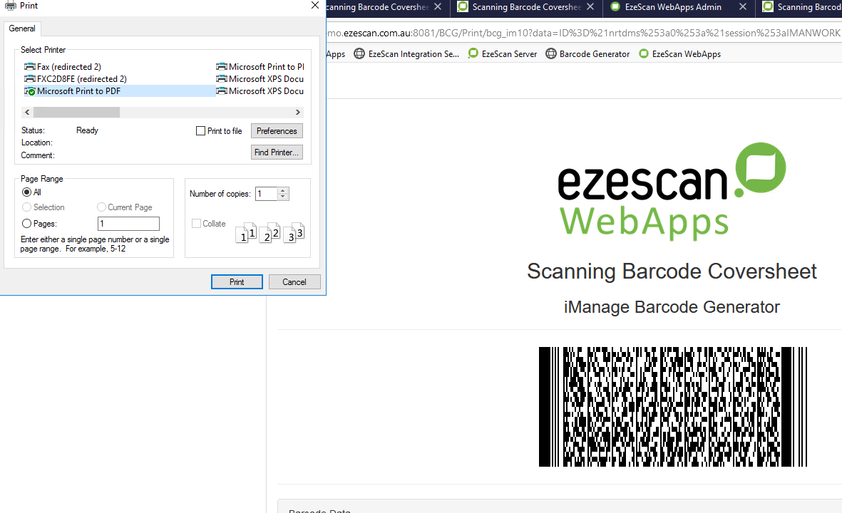 If you got here , you may have successfully got the iManage Work Web Client to send a ‘Generate Coversheet Barcode with EzeScan’ request to an Ezescan WebApps Barcode Coversheet App Page via theEWA Barcode Printer for iManage Web’service. You pressed print and got yourself a coversheet to place on top o fthe hardcopy document you want to store in Client/Matter folder in iManage.
