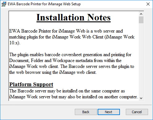 Now let's look at how to install the EWA Barcode Printer for iManage Web service.