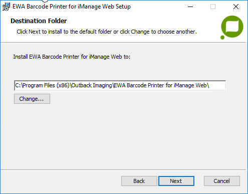 The Default install folder location is normally C:\ProgramData\Outback Imaging\EWA Barcode Printer for iManage Web