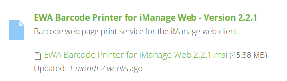 It is installed using ‘EWA Barcode Printer for iManage Web.msi’ installer.