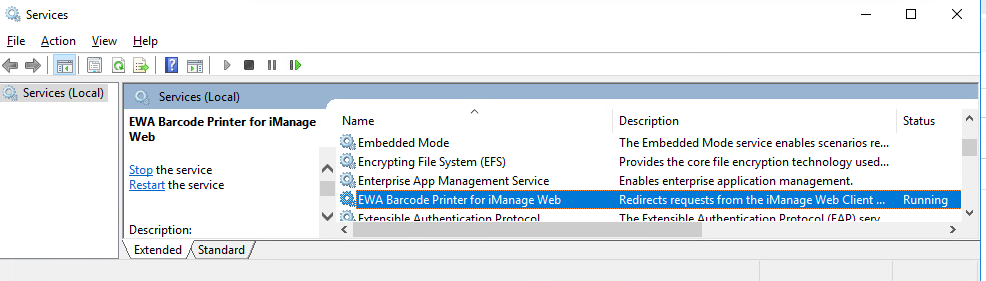 Also check Windows Services to see if the ‘EWA Barcode Printer for iManage Web’ service has been installed.