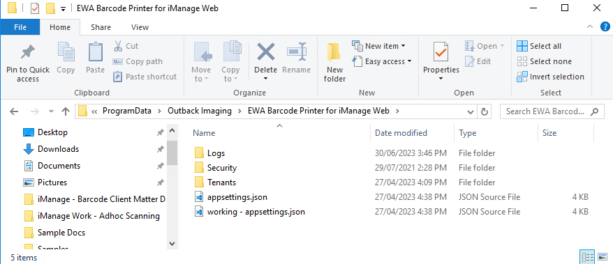 The file C:\ProgramData\Outback Imaging\EWA Barcode Printer for iManage Web\appsettings.json controls the settings used by the service.