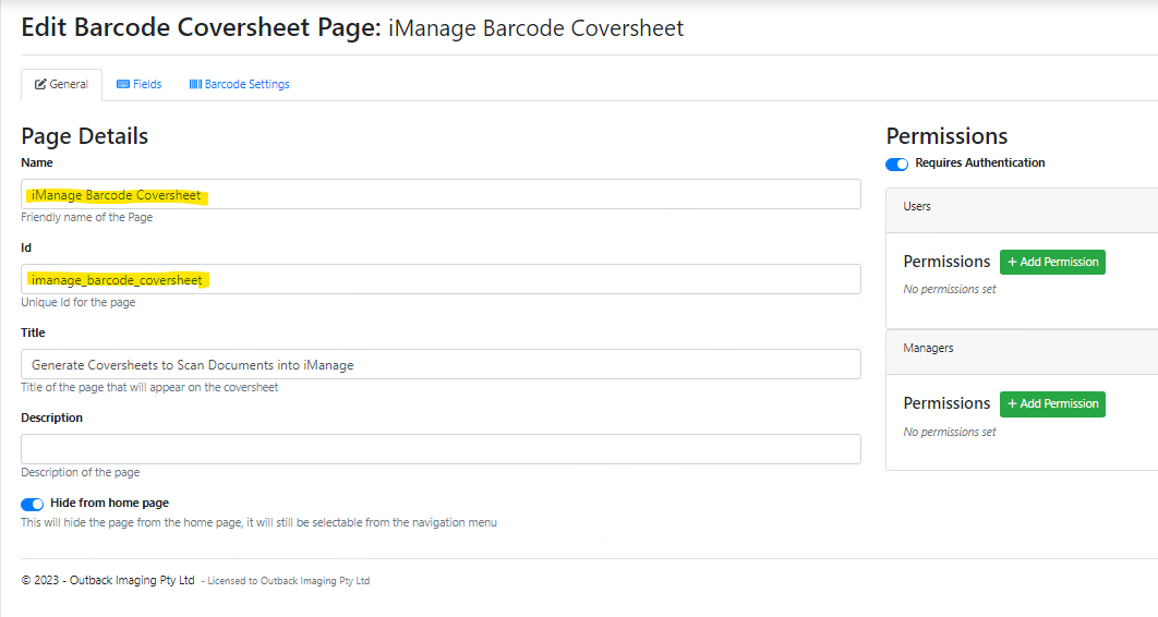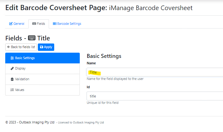 Name it ‘iManage Barcode Coversheet and this will give it an ID of ‘imanage_barcode_coversheet’