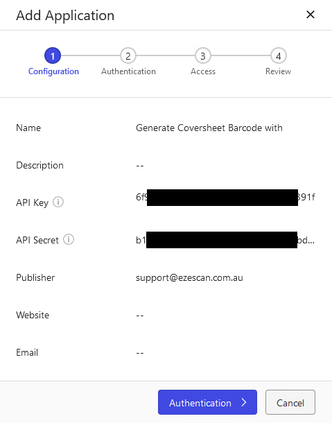 Click on the Add Application button, search for and add the EzeScan - Cloud Barcode Generator application.