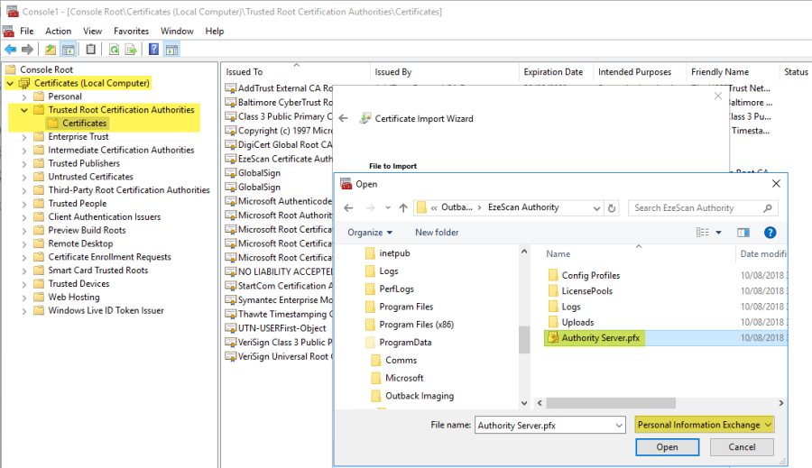 The certificate would contain both the private and public key and to obtain a chain of trust the certificate would need to be installed into the local computer Windows "Trusted Root Certification Authorities" repository. This would apply for every machine where the EzeScan client software is installed and for every machine where the EzeScan Authority web service is going to be accessed via a web browser.