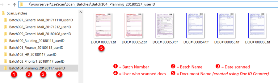The KFI example below has been set-up to create new batches in a nominated network folder. It also has been set to create document names using the Document ID functionality shown above.