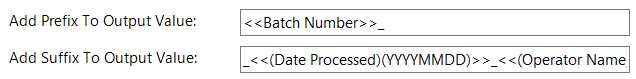 Add Suffix to Output Value: _ <<(Date Processed)(YYYYMMDD)>>_<<(Operator Name)>>