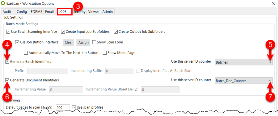 Leave the Workstation options settings unticked and make the settings in the scan jobs which require batch and document numbering set to utilise the ID numbers set in Authority Server.