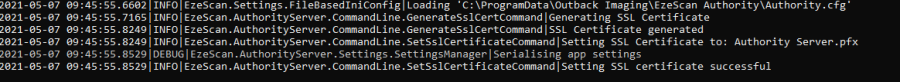 In the Authority Service ProgramData directory create a folder named Certificate C:\ProgramData\Outback Imaging\EzeScan Authority\Certficate Place the pfx certificate into this newly created folder. Open an administrative command shell and type the following command as a single line. The command line below has been spread over multiple lines for ease of reading. "C:\Program Files (x86)\Outback Imaging\EzeScan Authority\AuthorityServer.exe" setsslcert --certificatename "My_EzeScan_Authority_Certificate.pfx" --password "password" Where "My_EzeScan_Authority_Certificate.pfx" is your certificate file name and "password" is the password applied to the certificate. The above command will install the certificate and configure the Authority.cfg file with the required entries for running as HTTPS