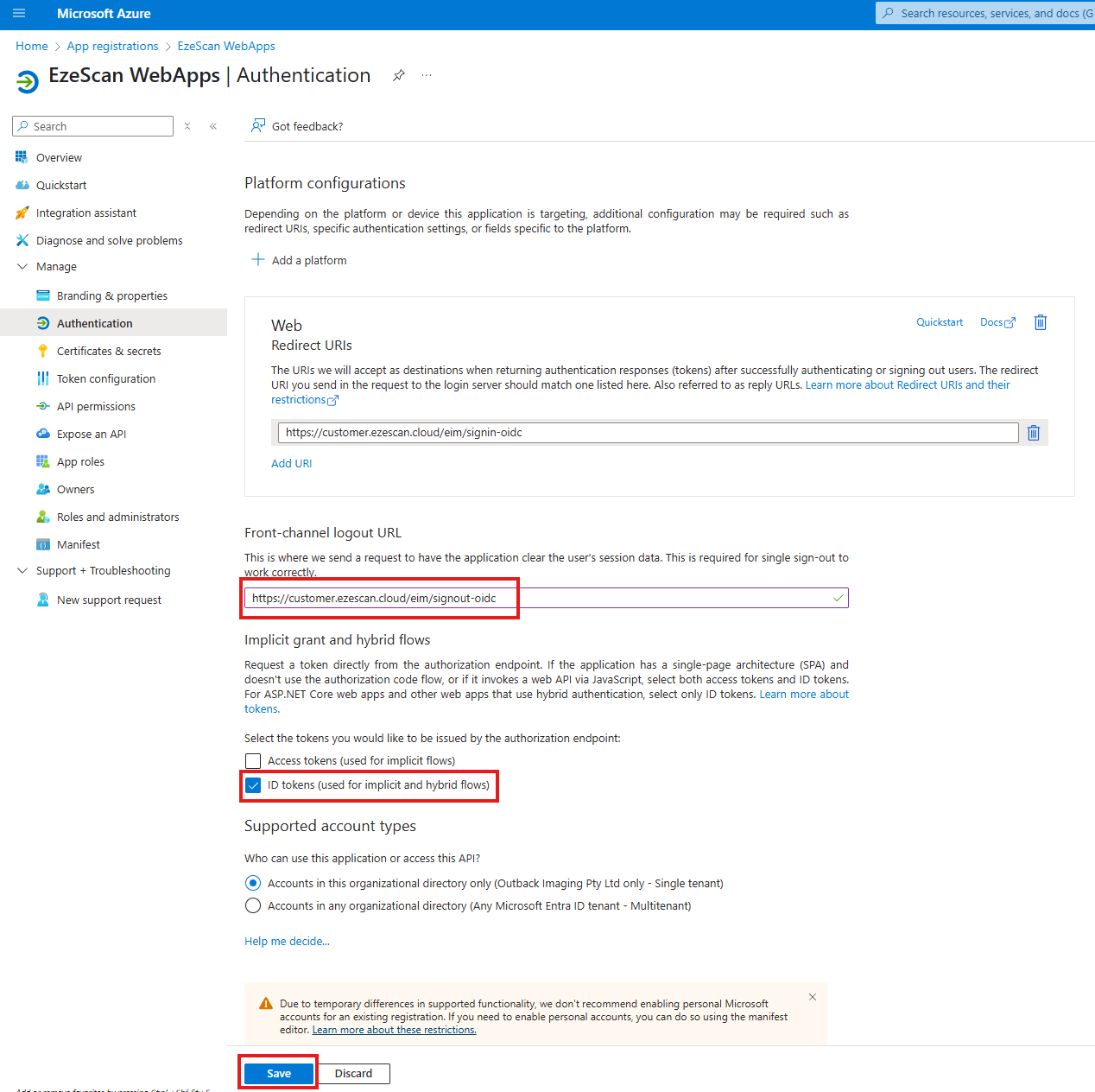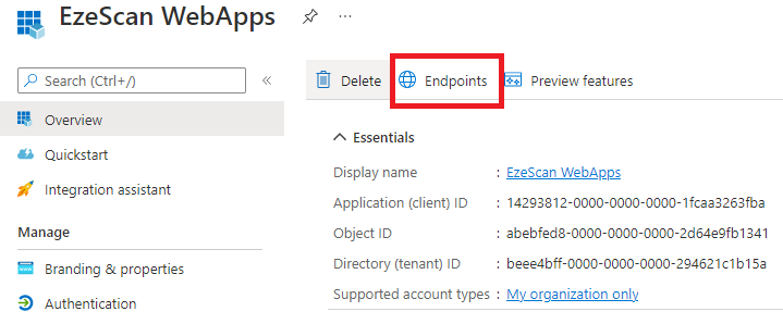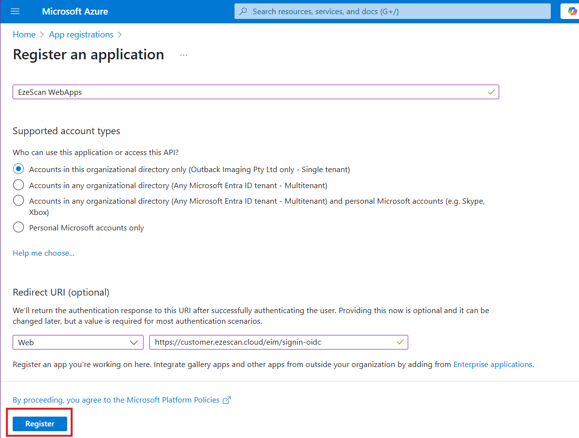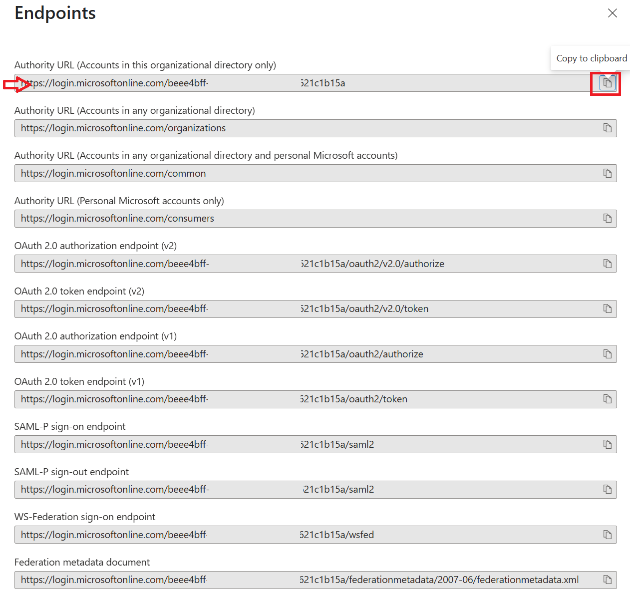 | 16 | Take note of the Authority URL (Accounts in this organizational directory only) by clicking the copy to clipboard button and saving it somewhere safe for later use. ![]() | ||||||||||