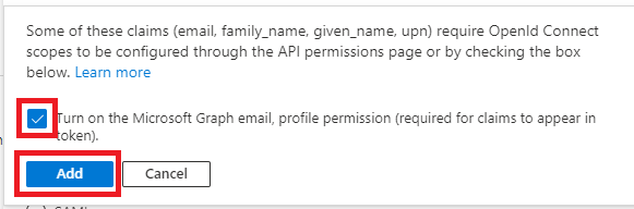 | 8 | If asked then tick the "Turn on the Microsoft Graph email, profile permissions" option and click Add. ![]() | ||||||||||