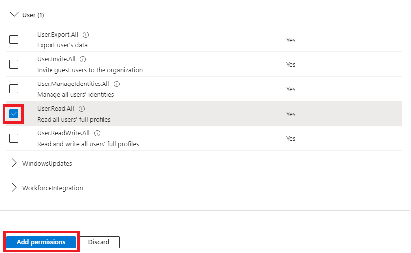 | 7 | Find and then tick the User.Read.All permission and then click the Add Permission button. ![]() | ||||||