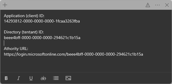 | 14 | Take note of the Application (client) ID and the Directory (tenant) ID by mousing over then clicking the copy to clipboard button and saving them somewhere safe for later use. ![]() | ||||||||||