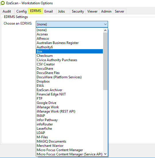 - Choose the EDRMS tab then confirm the BOX option is available in the dropdown.