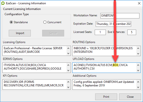 Should the BOX option not be available please contact your EzeScan representative, reseller or EzeScan directly for any required licensing update.