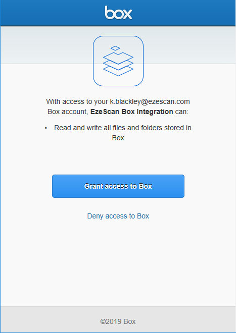 Client users of BOX and EzeScan will be required to enter their BOX authentication credentials to initially establish an authentication token noting that when the token expires they will be prompted to re-enter their credentials in order to re-authenticate.