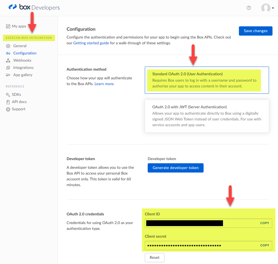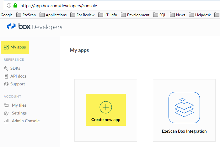 Configuring a customised OAuth registration option for EzeScan will require access to the BOX developer website associated with your organisation / login. Please follow the BOX links or refer to your BOX administrator for any applicable URLs.
