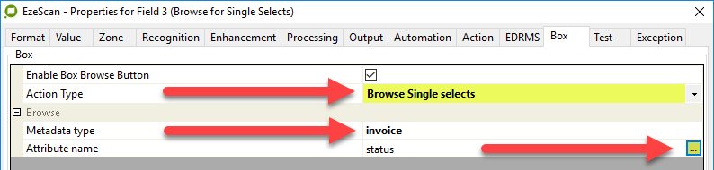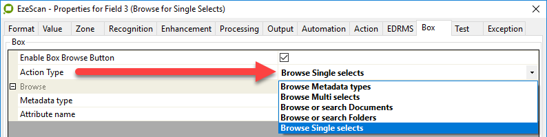 Both Multi and Single Select Types require a Metadata Type and Attribute Name defined within EzeScan.