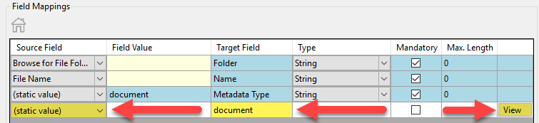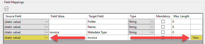 - Once the new data row is added, ensure the “Source Field” value is set to static value and not ignore. Then click View on the far right of the newly added field.