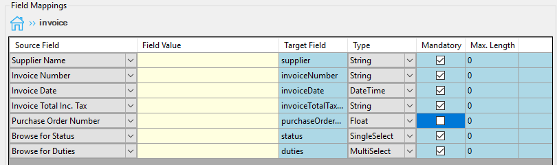 - The list of available fields will be displayed. Configure as required and map the KFI fields as required.