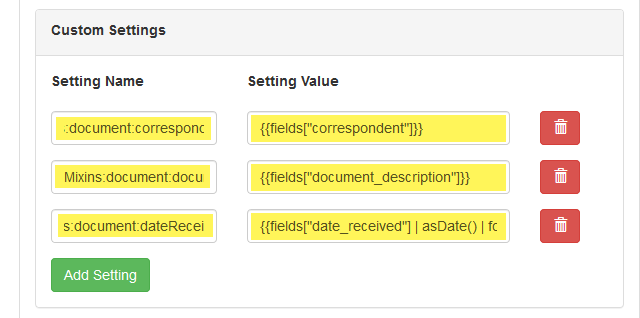 Each field will need to be added via the Add Setting button until all fields required for the Metadata Type have been added.