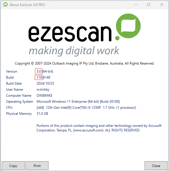 The EzeScan version information will now be displayed. In the example below the major build number is 5, the minor build is 0 (we normally just say 5.0) and it's a 64 bit windows application.