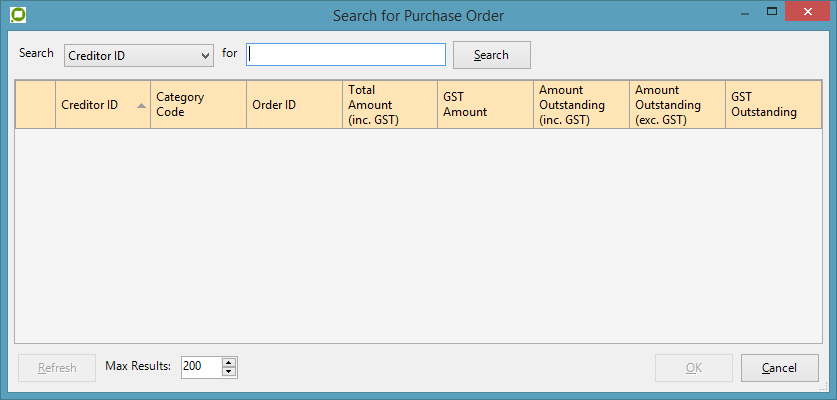 This will return the Creditor ID, Category Code, Site Number, Supplier Name, Bank BSB and Account details.If the ABN search fails then a search form can be used. The following screen will appear when selecting a search.