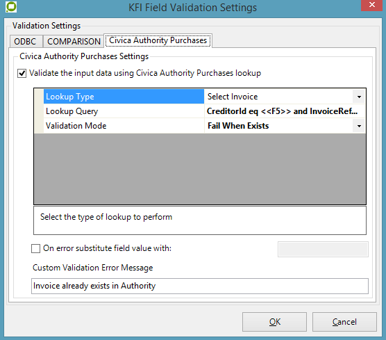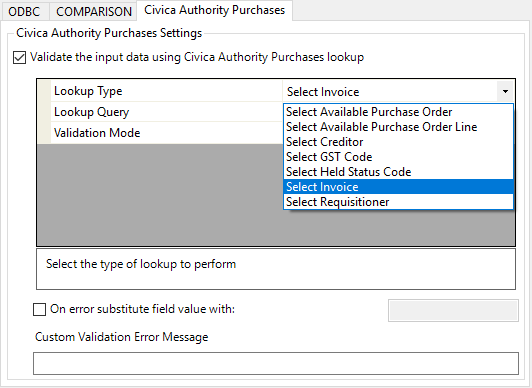 Select Civica Authority Purchases and tick “Validate the input data using Civica Authority Purchases lookup”. The following lookup Type options are shown: