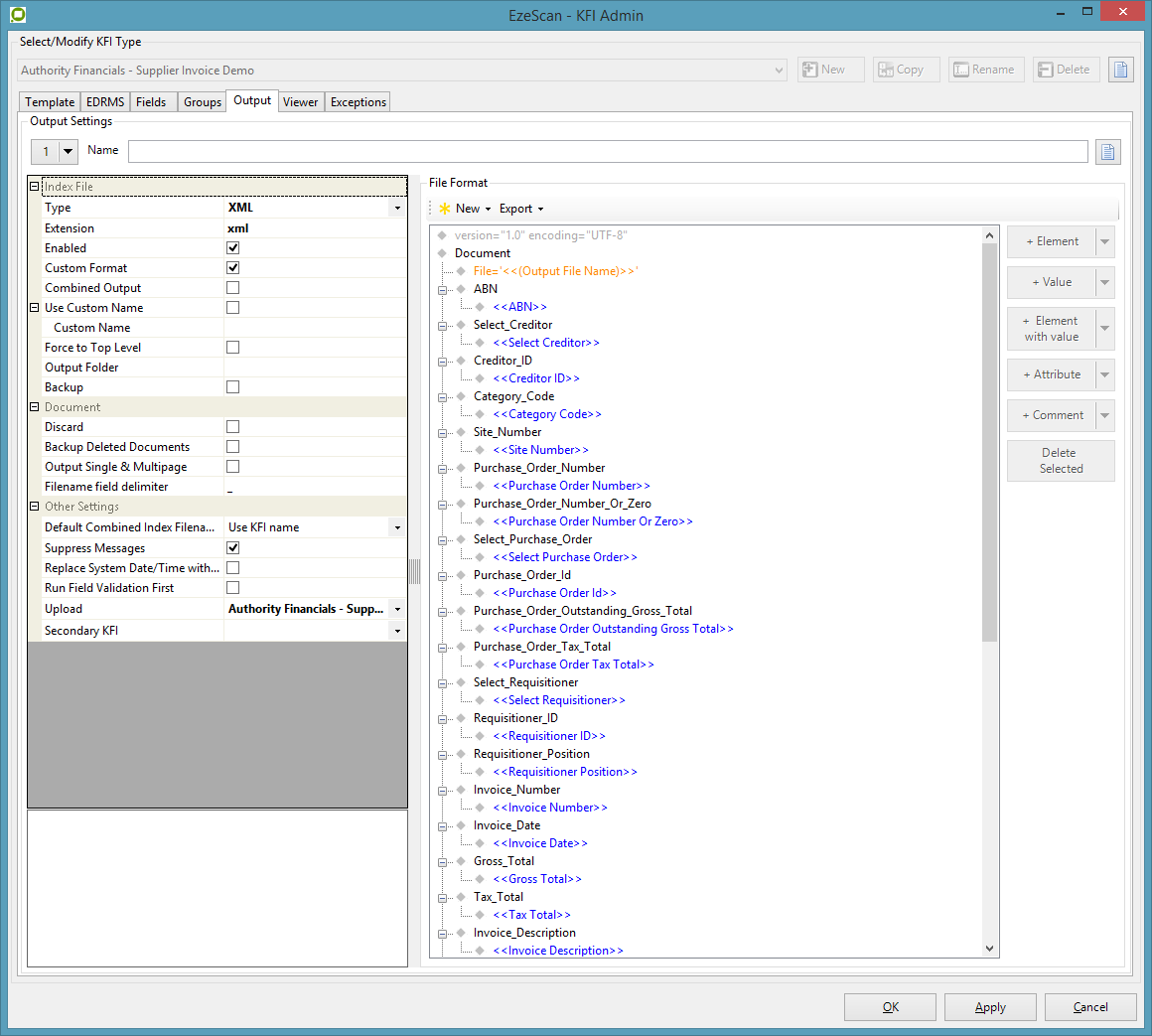 Index File settings. The KFI index file mappings need to output XML data. This is so order line data can be passed through the upload module.