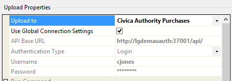 When configuring a Job, KFI or UPLOAD to use the Civica Authority Purchases connector the connection settings panel must be filled in. There are two ways this can be achieved: