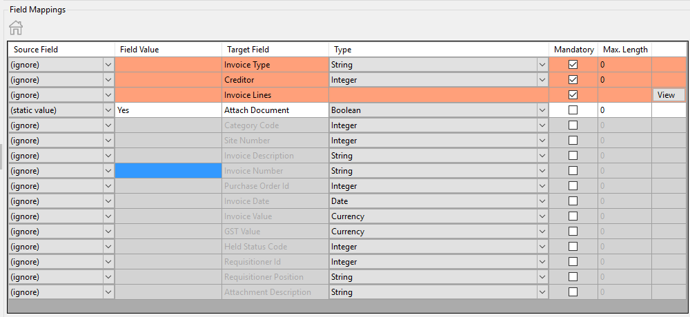 The invoice Lines fields are configured under the “View” button.