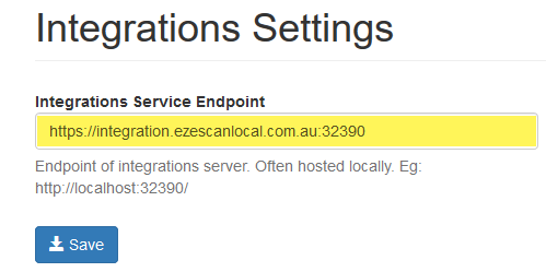 - In Integration Settings add the EzeScan Integration URL as defined in the EzeScan Endpoint.