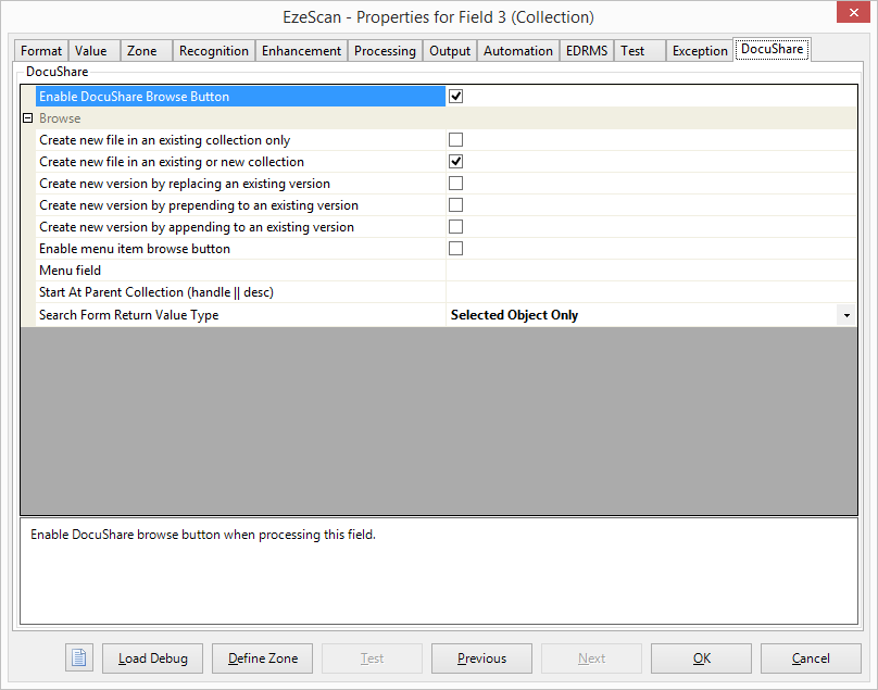 When ticked this option enables the DocuShare Browse button on the EzeScan Viewer KFI indexing panel. This will allow the KFI operator to choose which DocuShare collection the new document should be placed into as it is stored in DocuShare.