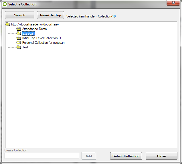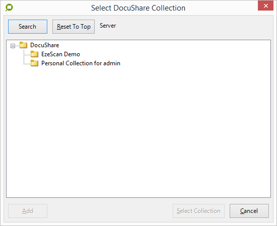 Depending on the DocuShare KFI options selected, the operator can browse Documents and Collections and also can create Collections.